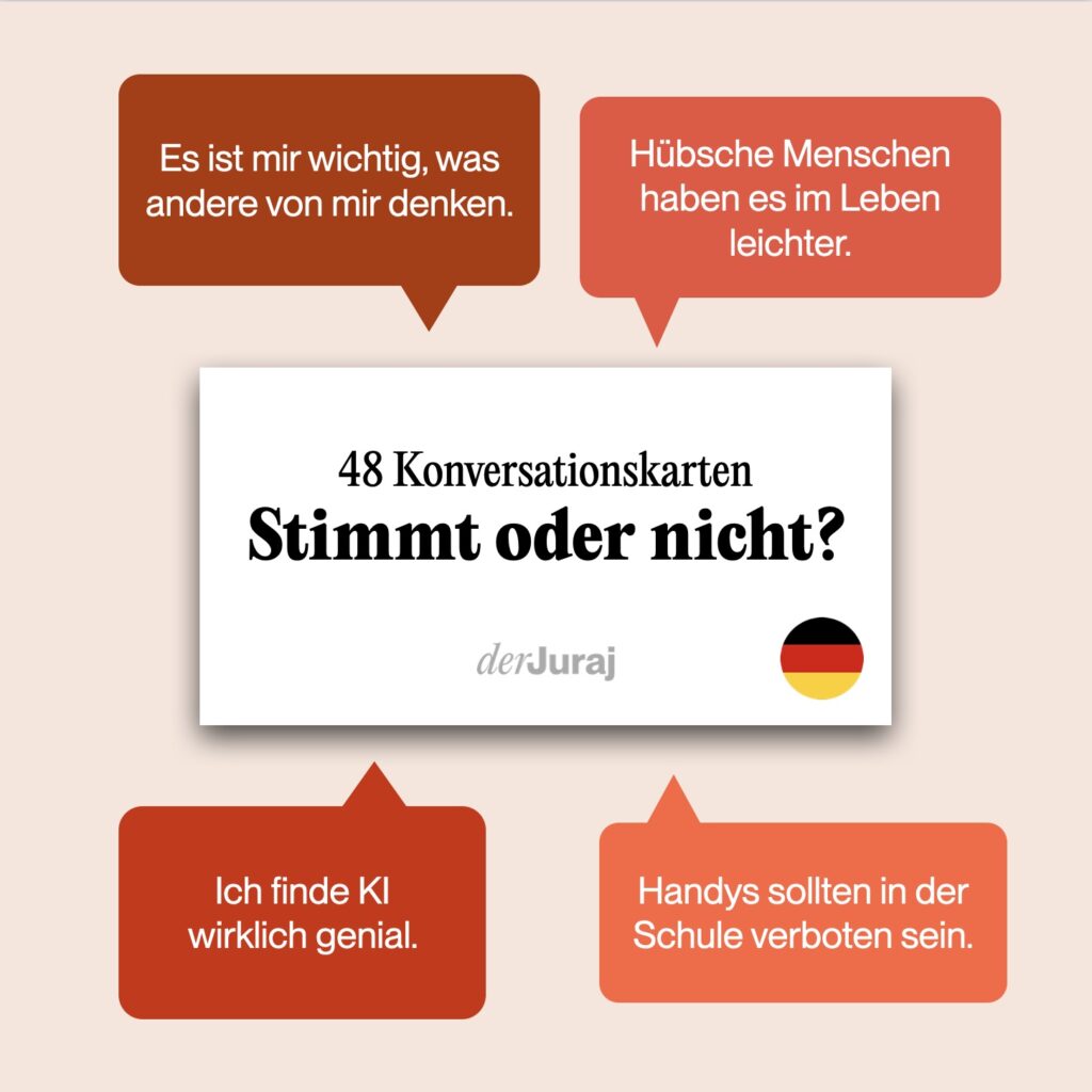 Sada Konversationskarten: Stimmt oder nicht? je určena k rozvoji diskusních dovedností, schopnosti vyjadřovat souhlas či nesouhlas a formulovat vlastní názory.